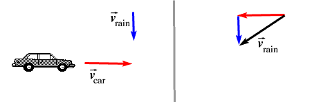 The left part of the figure shows what an observer would see that stands on the side of the road: the car is moving to the right, with its velocity vector shown in red, and the rain is falling straight down, with its velocity vector shown in blue.